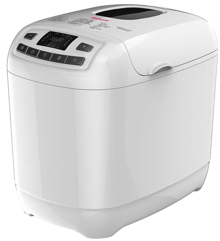 Управление сенсорное, есть LED-дисплей. Хлебопечь выпекает буханки на 750 г и 1 кг. Из полезных функций – 13 программ, 3 степени прожарки корочки, звуковой сигнал о необходимости добавить ингредиенты (орехи, злаки и т. д.), приготовление йогурта (!), джема и варенья. Хлебопечь оснащена памятью на 10 минут, таймером (отложенный старт до 13 часов) и подогревом готового батона в течение 1 часа.