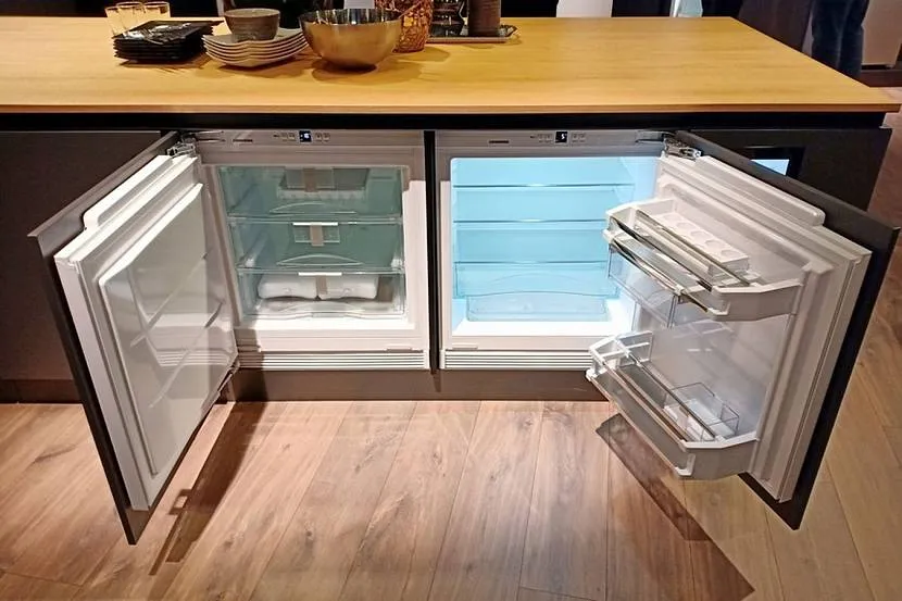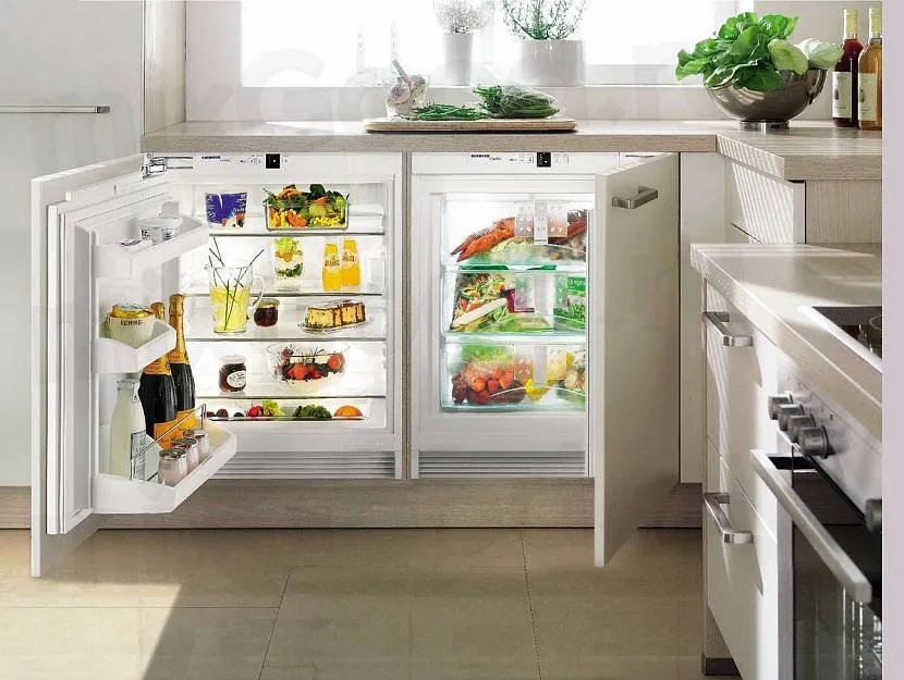 Маленький встроенный холодильник под рабочей зонойИсточник ciscoexpo.ru