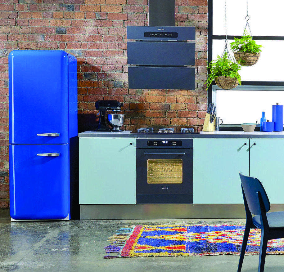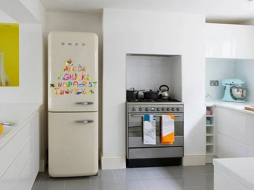 Малогабаритную модель высотой до 80 см размещают под столешницей рабочего пространства, барной стойки или обеденного гарнитура. Для миниатюрного холодильника в интерьере кухни не нужно много места. Агрегат гармонично вписывается в композицию с остальной мебелью. Дверцу оклеивают пленкой, повторяющей рисунок на предметах.