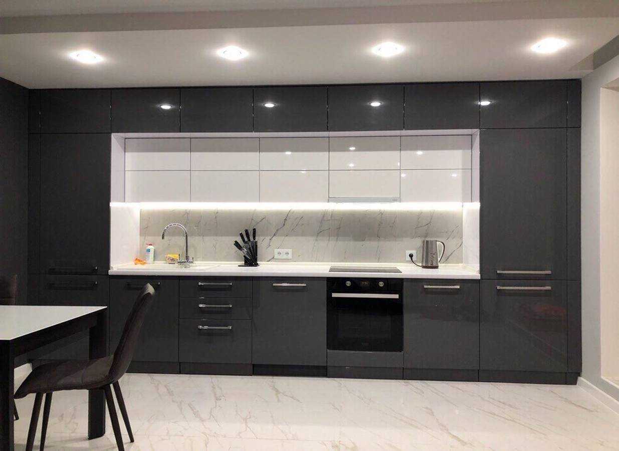 Если вы хотите, чтобы кухня располагалась на одной стене с использованием максимума пространства, стоит выбрать решение, XL, т. е. гарнитур под самый потолок. Это может быть один ряд высоких, емких шкафов или два ряда нижних шкафов различной глубины. Кухня, тянущаяся под сам потолок — настоящий хит. Она отлично смотрится и позволяет максимально использовать доступное пространство.