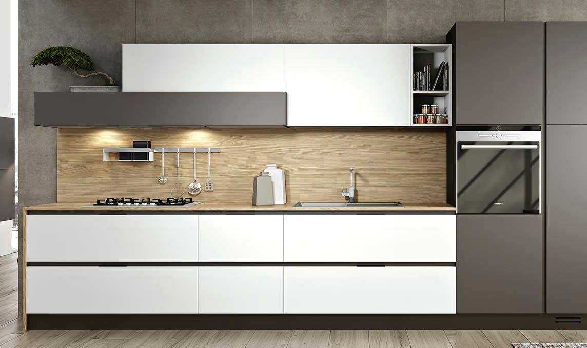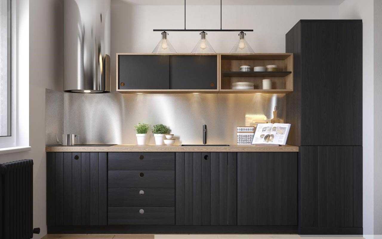 В готовых кухонных гарнитурах создано множество цветовых дуэтов, которые могут соответствовать интерьеру в любом стиле. Окрашенная древесина, например, груша, дуб, сосна или венге, происходит из коллекции новейшего декора, который может быть успешно найден у производителей полов или комнатной мебели, поэтому вы легко создадите согласованный интерьер, а кухня будет выглядеть как созданная на заказ. Один из способов организовать прямую кухню — это установить два больших шкафа со встроенной бытовой техникой на двух концах с нишей с рабочей столешницей между ними. Кухня на одной стене позволяет обустроить место для удобного обеденного уголка. Он может, например, отделять кухонную зону от гостиной.