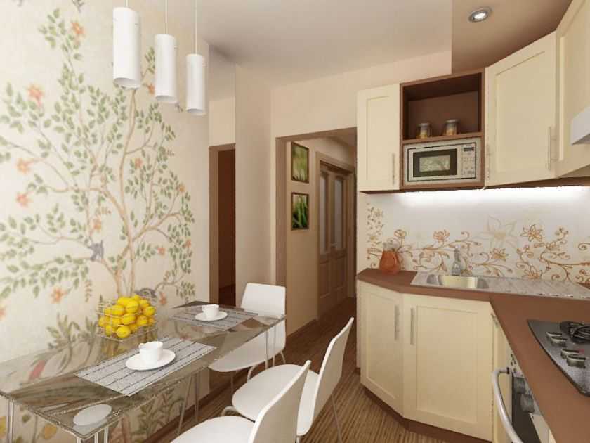 Обои для кухни желательно выбрать без резких контрастов и больших рисунков. Фотообои углубляют пространство, можно ими выделить обеденную зону.