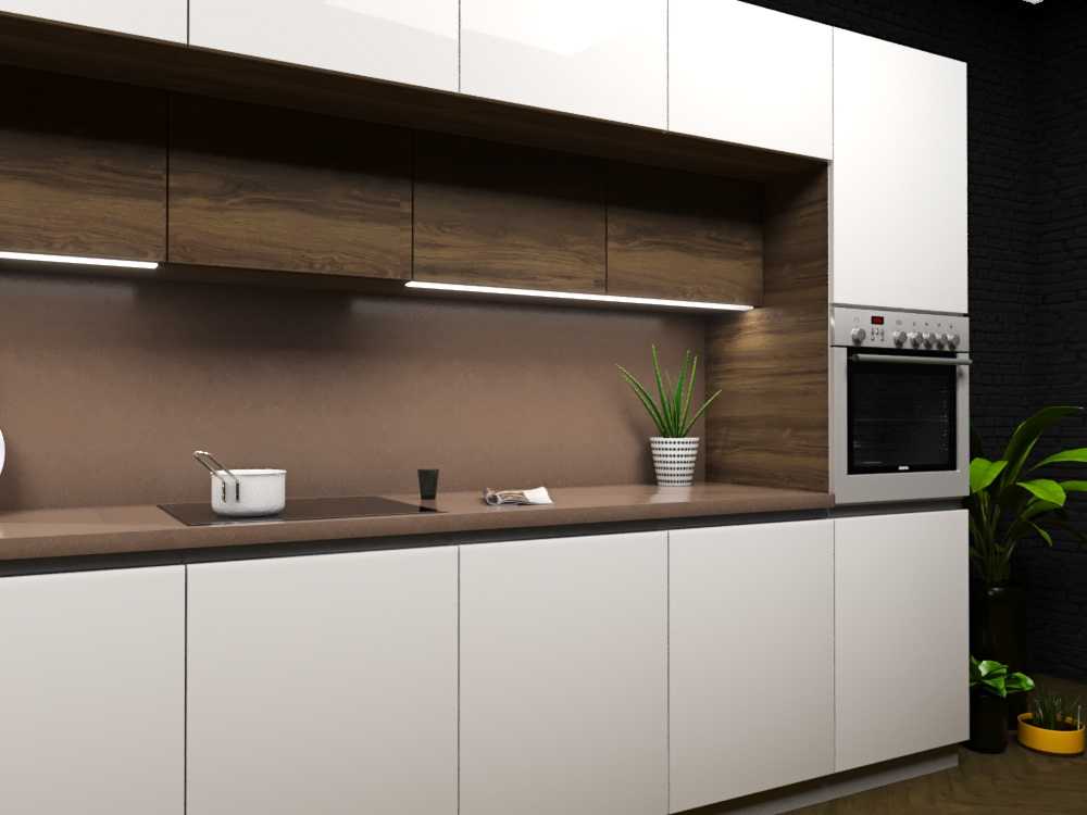 При расположении шкафов и бытовой техники на маленькой кухне в ряд, стоит соблюдать порядок: холодильник, раковина, плита. Расположение раковины посередине обеспечивает легкий доступ к воде во время первоначальной очистки продуктов и в момент приготовления. Вся бытовая техника на маленькой кухне должна быть отделена столешницей. Минимальная длина столешницы между холодильником и раковиной и с обеих сторон духовки составляет 40 см. На каждой маленькой кухне должна быть столешница длиной не менее 80 см. В прямой кухне обычно разделяется раковина и плита. На ограниченной площади плиту также можно разместить между холодильником и раковиной.
