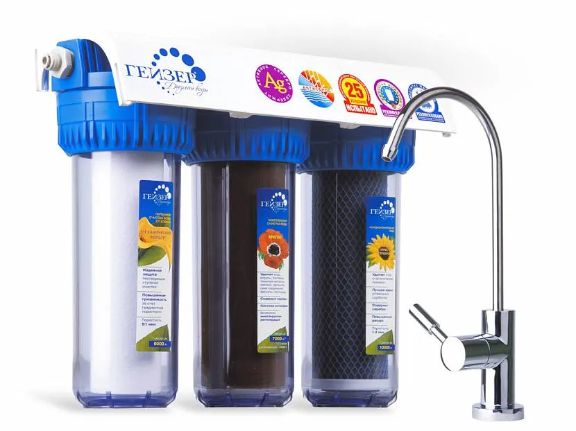 Старейшая из отечественных фирм, представленных здесь. Основана ещё в 1986 году и с тех пор запатентовала немалое количество разработок, которые с успехом применяет в своих водоочистителях даже сейчас. Среди этих разработок особое место занимает мелкопористый ионообменный полимер, который был признан мировыми производителями и применяется не только в отечественных фильтрах. Ещё одна особенность водоочистителей Гейзер – картриджи к ним подходят как собственные, так и от Аквафора.