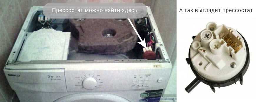 Еще один датчик, который может повлиять на функцию нагрева воды — прессостат. Он определяет, есть ли вода в барабане стиральной машины, и регулирует ее уровень. Этой деталью оснащены все современные машины автоматического типа, включая машины марки Candy. Поломка прессостата не позволяет машине набрать достаточное количество воды, поэтому не включается ТЭН.