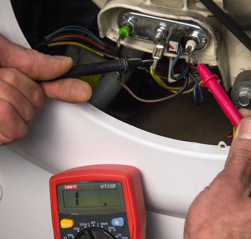 Наиболее частой причиной проблем с нагревом воды в стиральной машине считается неисправность нагревательного элемента или ТЭНа. Из-за вибраций в процессе стирки он может отсоединиться от проводов, и в этом случае достаточно лишь вернуть все соединения на место. Но иногда причина сбоя в работе намного серьезнее. Высокая жесткость воды, плохие моющие средства или неправильная эксплуатация стиральной машины приводят к образованию твердых отложений на поверхности ТЭНа, в результате чего он выходит из строя. Для проверки нагревательного элемента следует пригласить мастера. Он с помощью специального прибора — мультиметра — сможет определить, есть ли поломка.