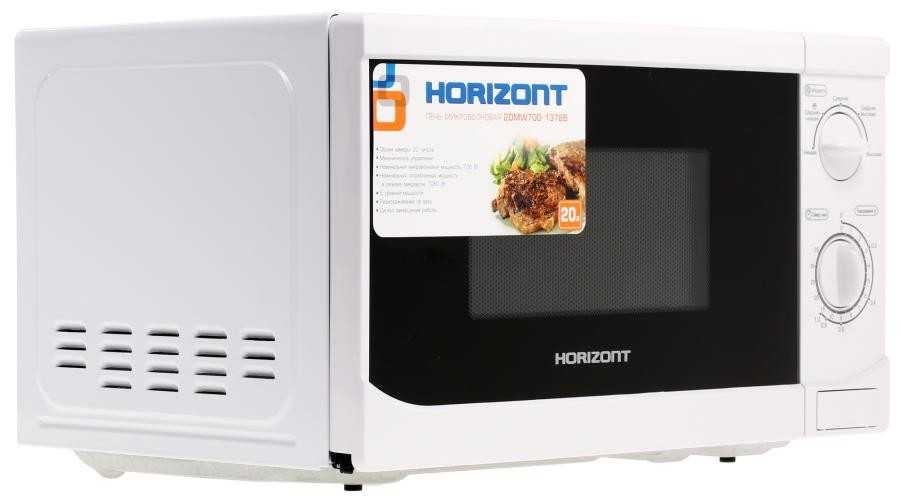 Horizont 20MW700-1378B — 20-литровая печка, рассчитанная на 0,7 кВт. Эмалированное покрытие камеры. Механическое управление, поворотные переключатели. Цена — от 2930 рублей.