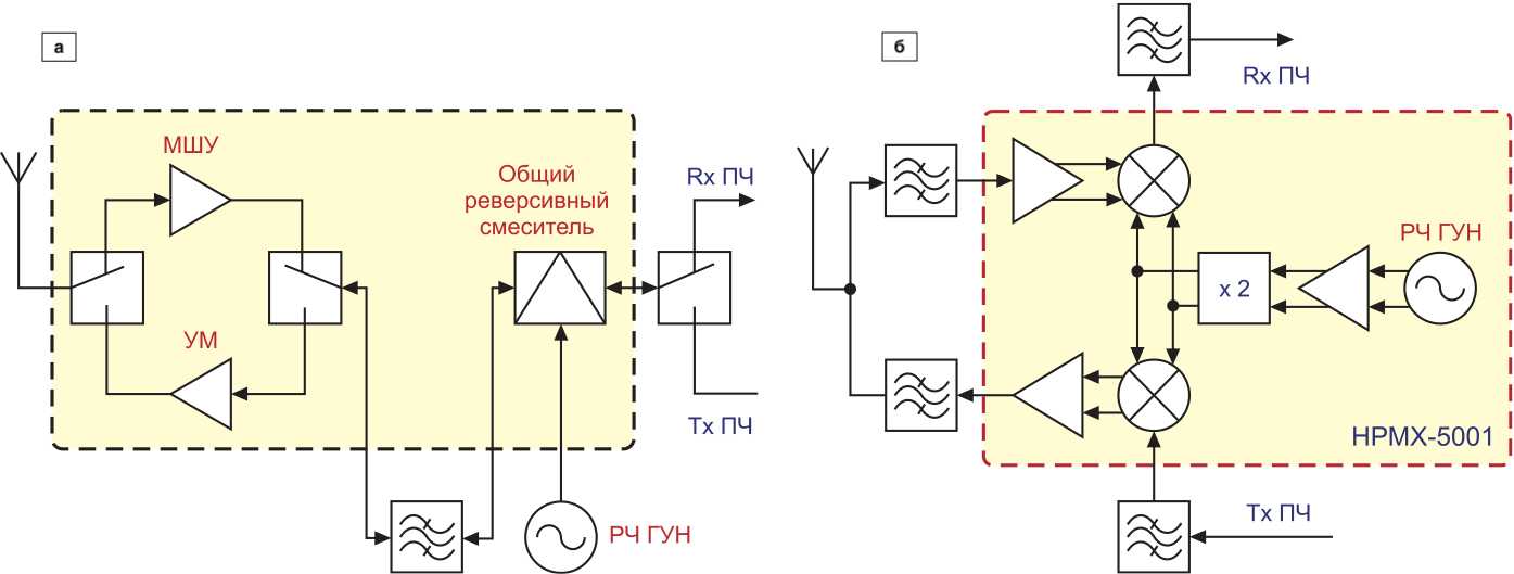 Сдвоенные, или дуальные (Dual Upconverters/Downconverters), как и реверсивные, или двунаправленные (Reverse Converter) преобразователи частоты, можно использовать для переноса частоты вверх или вниз (с повышением или понижением) в определенном диапазоне по обе стороны от рабочей частоты ПЧ или baseband-сигнала, что для устройства с временным дуплексированием TDD иллюстрируется на рис. 8а. В качестве примера использования реверсивного преобразователя частоты в приемопередающем устройстве системы с временным дуплексированием TDD на рис. 8б показано применение преобразователя HPMX‑5001 компании Agilent. Данная модель преобразователя позволяет осуществить перенос сигнала РЧ-диапазона 1,5–2,5 ГГц в тракте приема вниз на частоту ПЧ, как и преобразование с повышением частоты ПЧ-РЧ в тракте передачи. Следует отметить, что в данной ИС (Upconverter/Downconverter) для преобразования сигналов используются все-таки раздельные узлы приема и передачи, а не полностью реверсивный общий узел, показанный на рис. 8а.