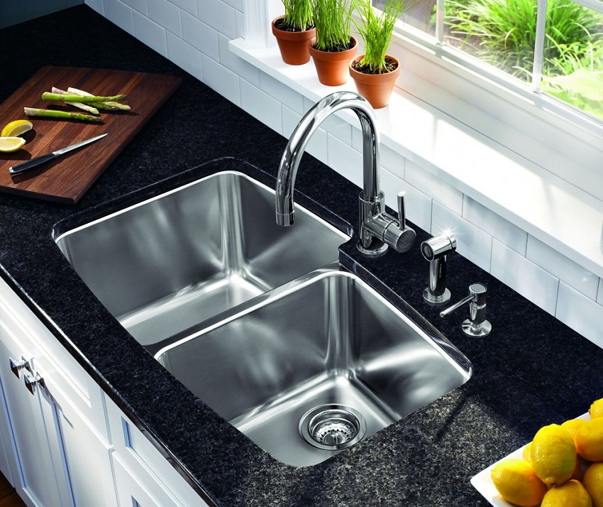 Нередко используются и двойные мойки, оснащенные разными или одинаковыми по размеру чашами. В таком случае возможно использование как одного, так и двух смесителей. Выпускаются также виды, состоящие сразу из трех чаш, однако они слишком громоздкие и используются редко.