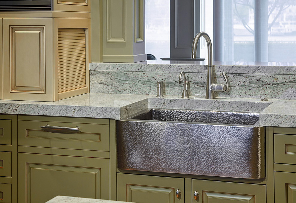 - Медные. Это совсем недешевые варианты. Подходят для кухонных интерьеров особого плана. Сложны в уходе (требуются специальные средства) и не имеют широкого распространения.Металлические раковины для кухни: медная и из нержавейки без крыльев