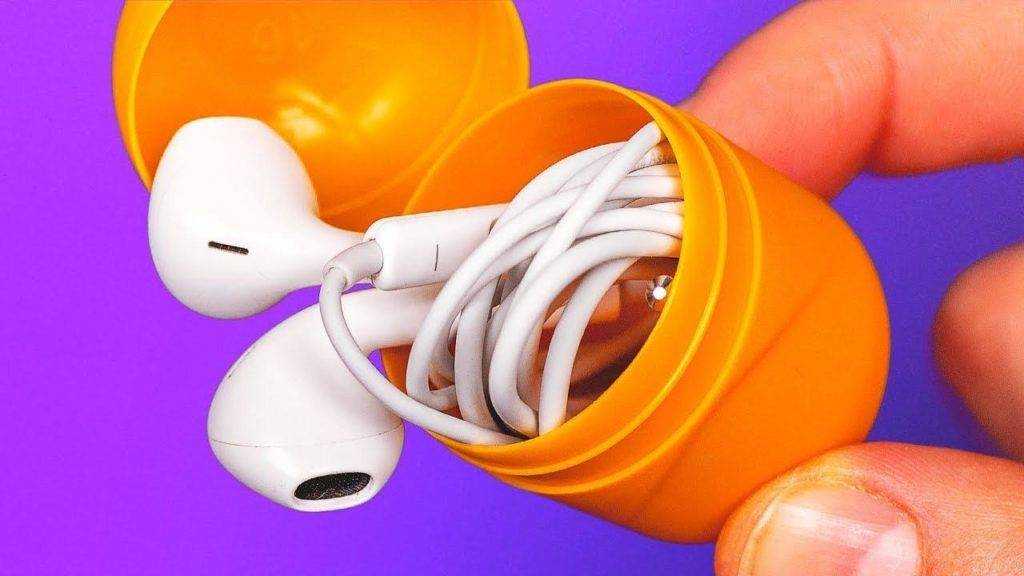 Оригинальный лайфхак, чтобы хранить проводные наушники – использовать пластмассовый футляр от детской игрушки «Киндер-сюрприз». Шнур гарнитуры нужно несколько раз собрать вокруг трех пальцев и упаковать «скрутку» в разборной кокон. Это эффективный и недорогой вариант хранения стереонаушников, поскольку в такой коробке они защищены от грязи, пыли, влаги и механического повреждения. Этот самодельный футляр, конечно, не такой крутой, как для беспроводной гарнитуры Айфона, но при желании его можно задекорировать по своему вкусу.