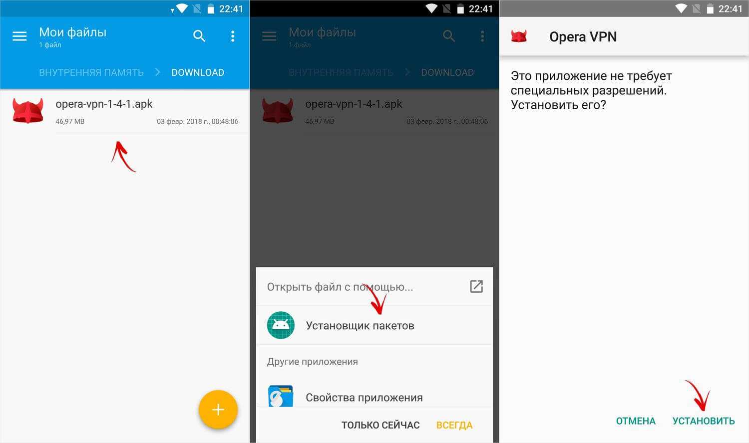 Щелкните на .apk-файл и выберите «Установщик пакетов». Затем нажмите «Установить».