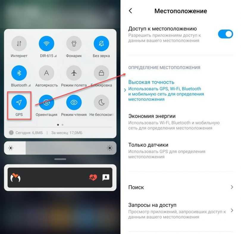 На смартфонах, работающих на более актуальных версиях Android GPS можно включить через панель уведомлений. Для этого достаточно активировать кнопку «GPS» (в зависимости от фирмы производителя может иметь другое название). Сделав долгое нажатие на данный пункт вы сможете перейти в настройки местоположения и изменить другие параметры. Например, включить режим экономии энергии или высокую точность.