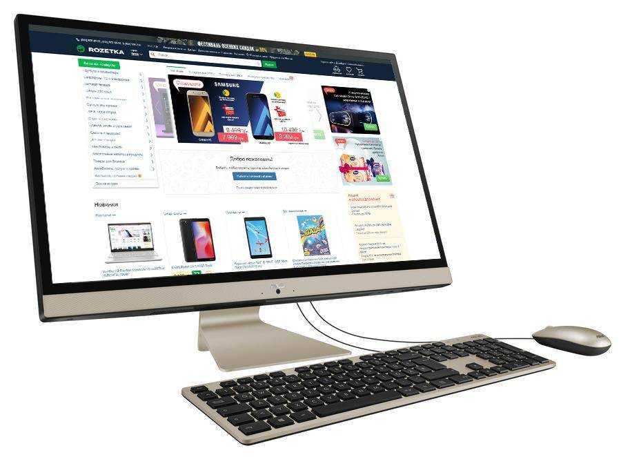 Притом, что купить эту модель можно за сумму от 34000 рублей, дешевле, чем обойдётся большинство других моноблоков. В комплекте к ней идёт диск SSD объёмом 256 ГБ и 8 ГБ оперативной памяти, а список интерфейсов включает все необходимые разъёмы, удобно расположенные на корпусе. Углы обзора почти максимальные для моноблоков, а в комплекте к нему идут клавиатура и мышь.