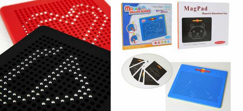 12. Магнитный планшет Магпад — представляет собой пластмассовую доску с ячейками, в которой катаются металлические шарики. Каждый шарик можно поднять через дырочку магнитным стилусом (ручкой), и он зафиксируется возле поверхности