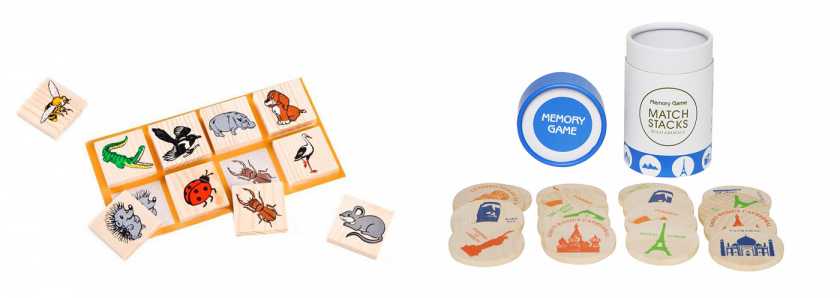 2. Лото и мемори с толстыми, деревянными элементами — позволит вашему малышу развиваться и познать себя и окружающий мир. Ребенок будет знакомиться с различными предметами, которые его окружают и научится совмещать картинки, искать одинаковые предметы и составлять пары.