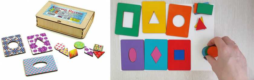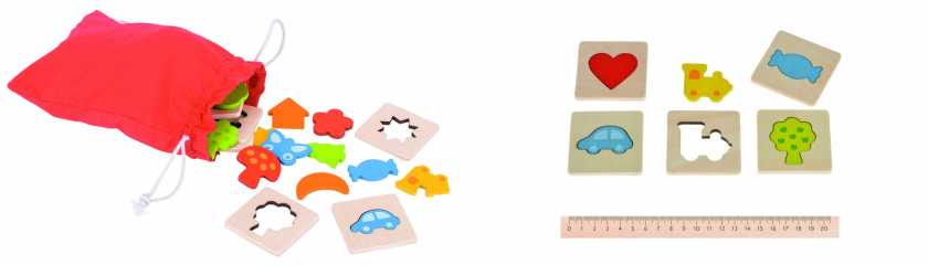9. Пазл-вкладыши Goki — ребенку на ощупь предлагается определить фигурку, которая подойдет к контуру на пластинке. Фигурки при этом находятся в мешочке, то есть игрок их не видит. Развивают моторику, сенсорику, тактильную чувствительность и умение распознавать предметы.