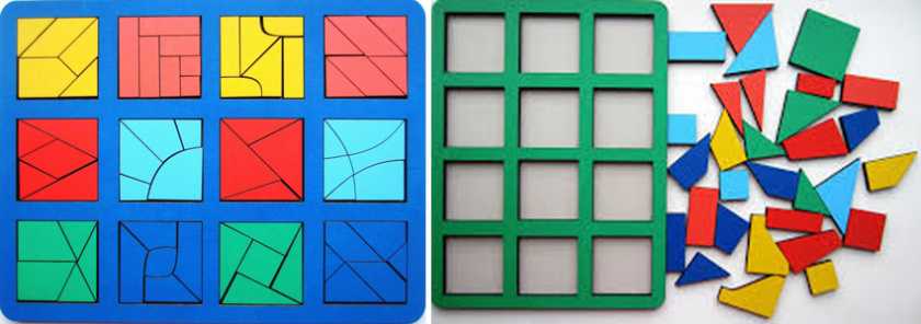 7. «Сложи квадрат» Б. П. Никитина — похожи на головоломку, но имеют несколько уровней сложности. Играя в эту настольную игру происходит тренировка в развитии цветоощущения и сообразительности при решении проблемы частей целого, их возможных взаимоотношений и взаиморасположений в пространстве игрового поля.