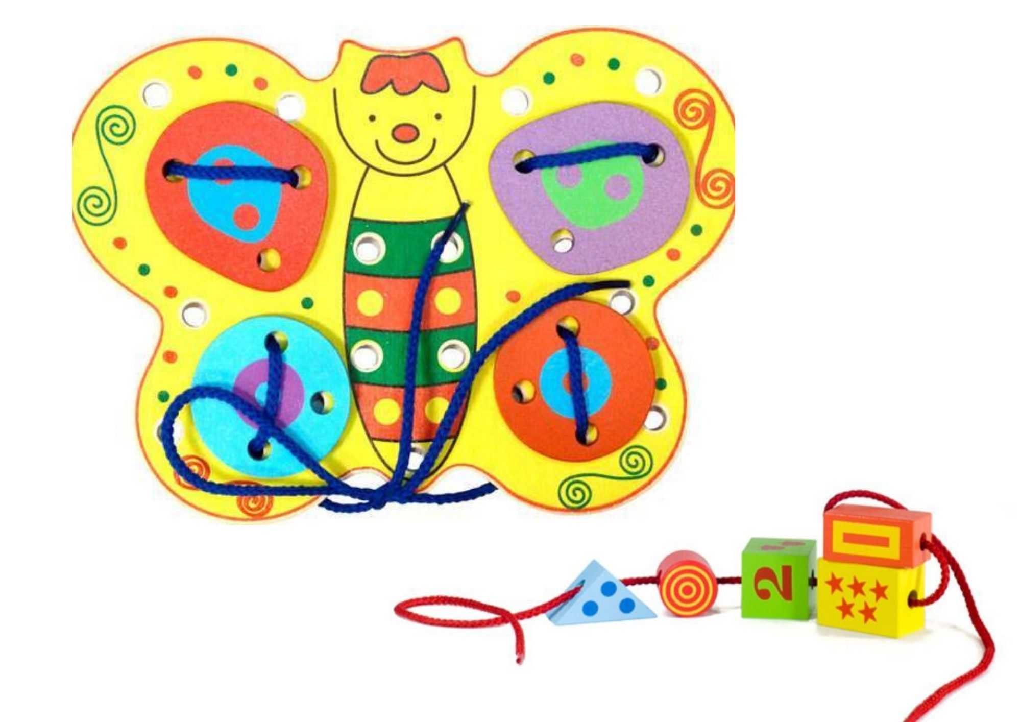 Шнуровка – незаменимая игра для развития мелкой моторики. Малышам от года подойдут шнуровки с крупными, яркими элементами. Они могут быть в форме бусин, фруктов, овощей, животных. Помимо развития координации и моторики, в такой игре хорошо запоминаются названия нанизываемых предметов.
