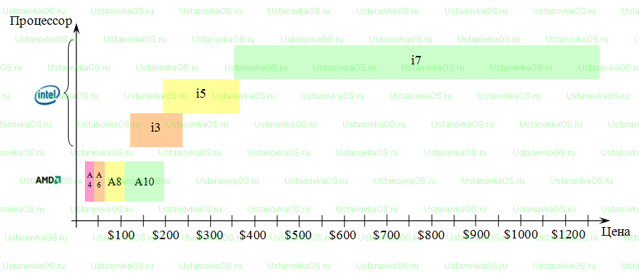 Если взять такие ходовые процессоры от компании Intel, как Core i3, Core i5 и Core i7, и сравнить по ценам с популярными А4, А6, А8 и А10 от AMD, а потом объединить результаты в виде графика, то итог получится таким, как представлено на рисунке ниже.