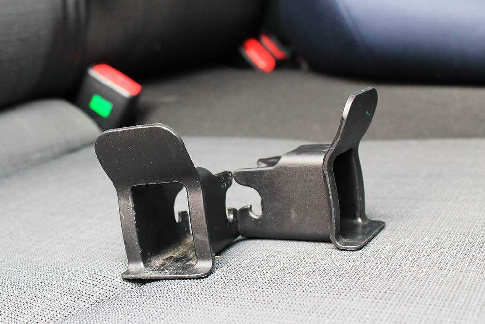 Изофикс — это такие металлические скобы. В некоторых авто они спрятаны внутри задних сидений, а в некоторых, как на этом фото, обозначены специальными направляющими Изофикс со стороны кресла напоминает автомобильный замок — аналогичная конструкция фиксирует двери автомобиля и крышку багажника. Здесь замки защелкиваются на скобах изофикс