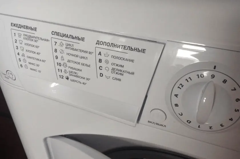 Обозначения на стиральной машине Hotpoint Ariston несколько отличаются от остальных. Кроме значков режимов стирки на панели, каждая программа пронумерована. Все условные знаки располагаются на лотке-дозаторе для моющих средств. Описания обозначений есть в инструкции по эксплуатации. Также найти расшифровку можно в таблице ниже.