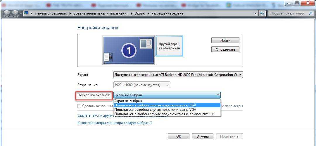 Здесь нужно найти еще один монитор, после нажатия на одноименную кнопку ОС напишет, что экран не определен. Это не страшно. Выбираем для него дискретную видеокарту, ставим в меню «Несколько экранов» — «Пытаться подключить через VGA», а также выбираем способ отображения – на одном экране, двух или же разделит картинку. После сохранения настройки, любой монитор, подключенный через выход VGA, автоматически будет работать от дискретного чипа.
