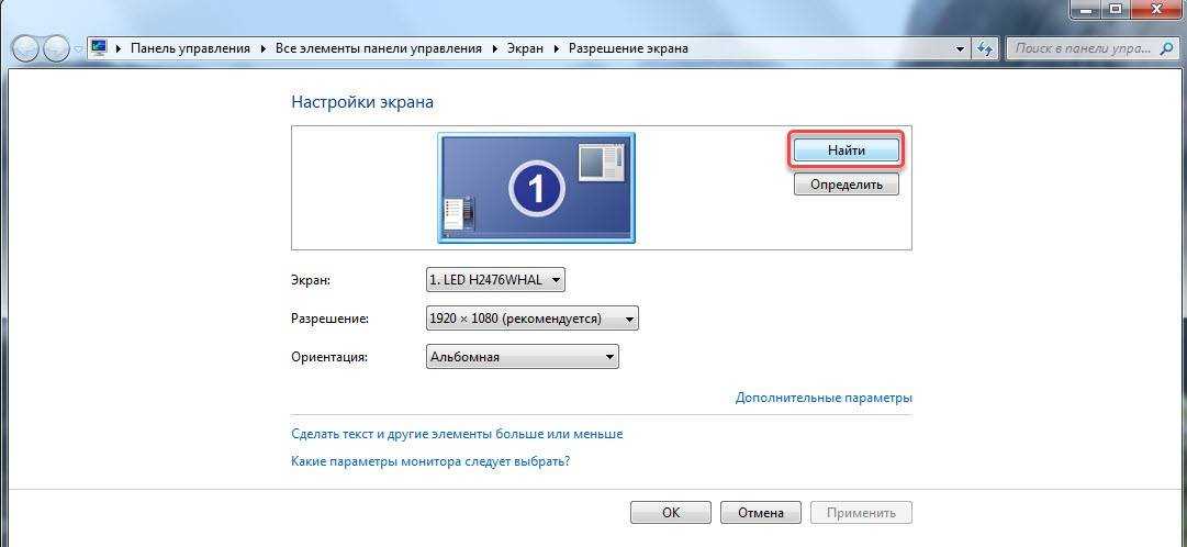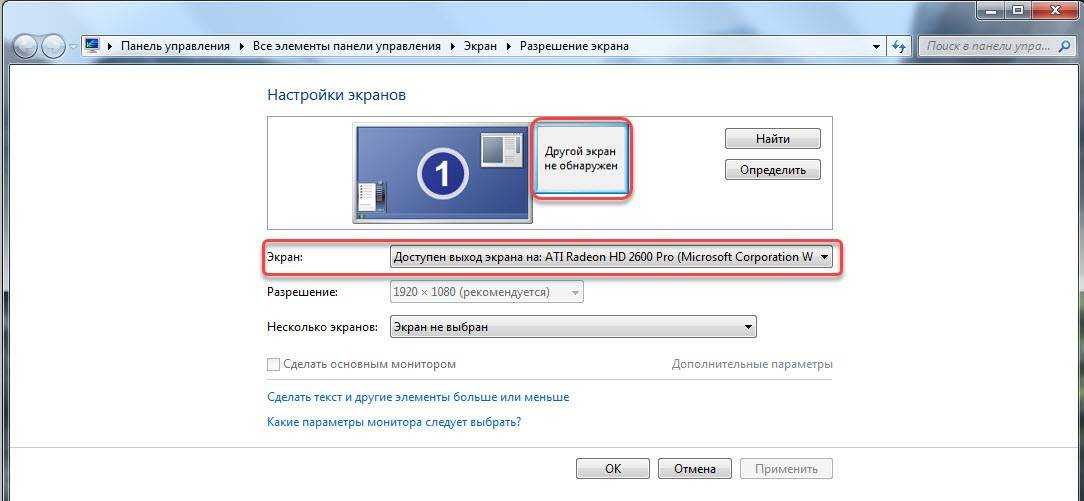 Система проводит поиск и сообщает, что другие мониторы не обнаружены. Подсвечиваем это оповещение. Затем жмём выпадающий перечень рядом с надписью «Экран». Указываем дисплей, соответствующий дискретному адаптеру.