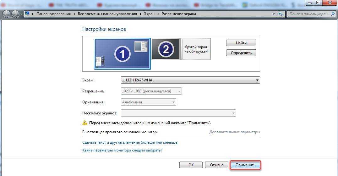 Важный момент – если настройка проводится без подключенного внешнего монитора, то выбирать отображение только на втором экране НЕ НУЖНО! В противном случае экран монитора погаснет и изменить что-либо можно будет только после подключения внешнего монитора.