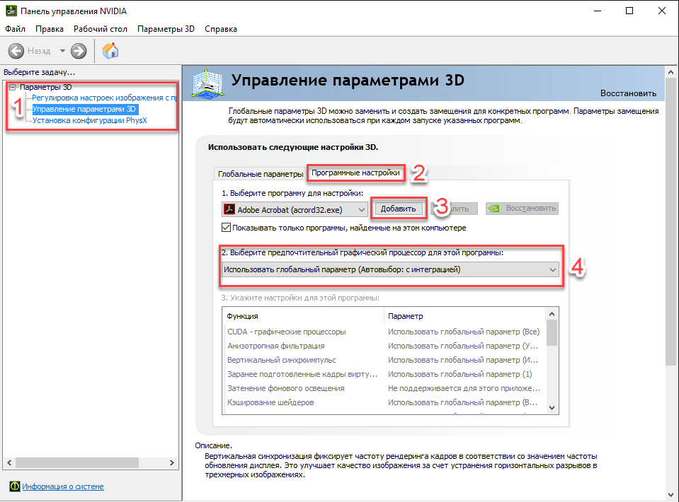 Затем слева выберите «Управление параметрами 3D». В основном окне на вкладке «Глобальные параметры» укажите «Предпочитаемый графический процессор».
