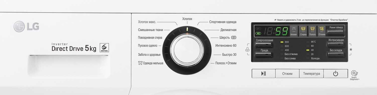 | Хлопок | Режим для стирки белья из хлопка; намного лучше отстирывает вещи благодаря технологии Inverter Direct Drive |