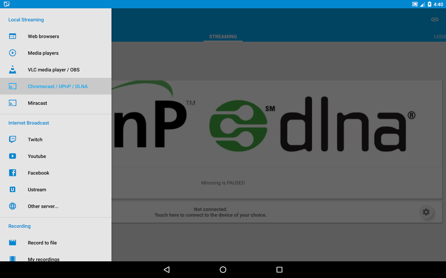 Для начала необходимо запустить приложение. Для этого перейдите в Настройки > Управление. Если используете программу постоянно, то для удобства рационально добавить ярлык в главное меню. После включения система запросит подтверждения использования конкретного гаджета из предложенного списка — мобильный или телевизор. Выберите второй вариант.
