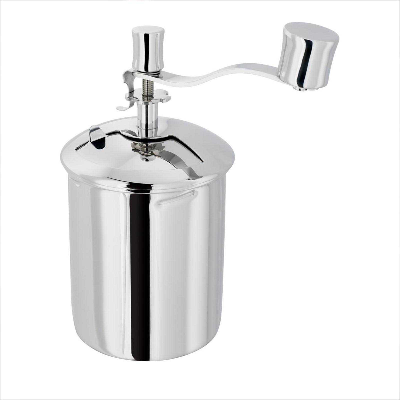 Помол осуществляет металлический диск, его толщина 6,5 мм. Степень помола можно регулировать винтом под ручкой. Сняв верхнюю часть кофемолки с ручкой и жерновами, потребитель получает зеркальную банку с крышкой, в которой можно хранить свежемолотый кофе.