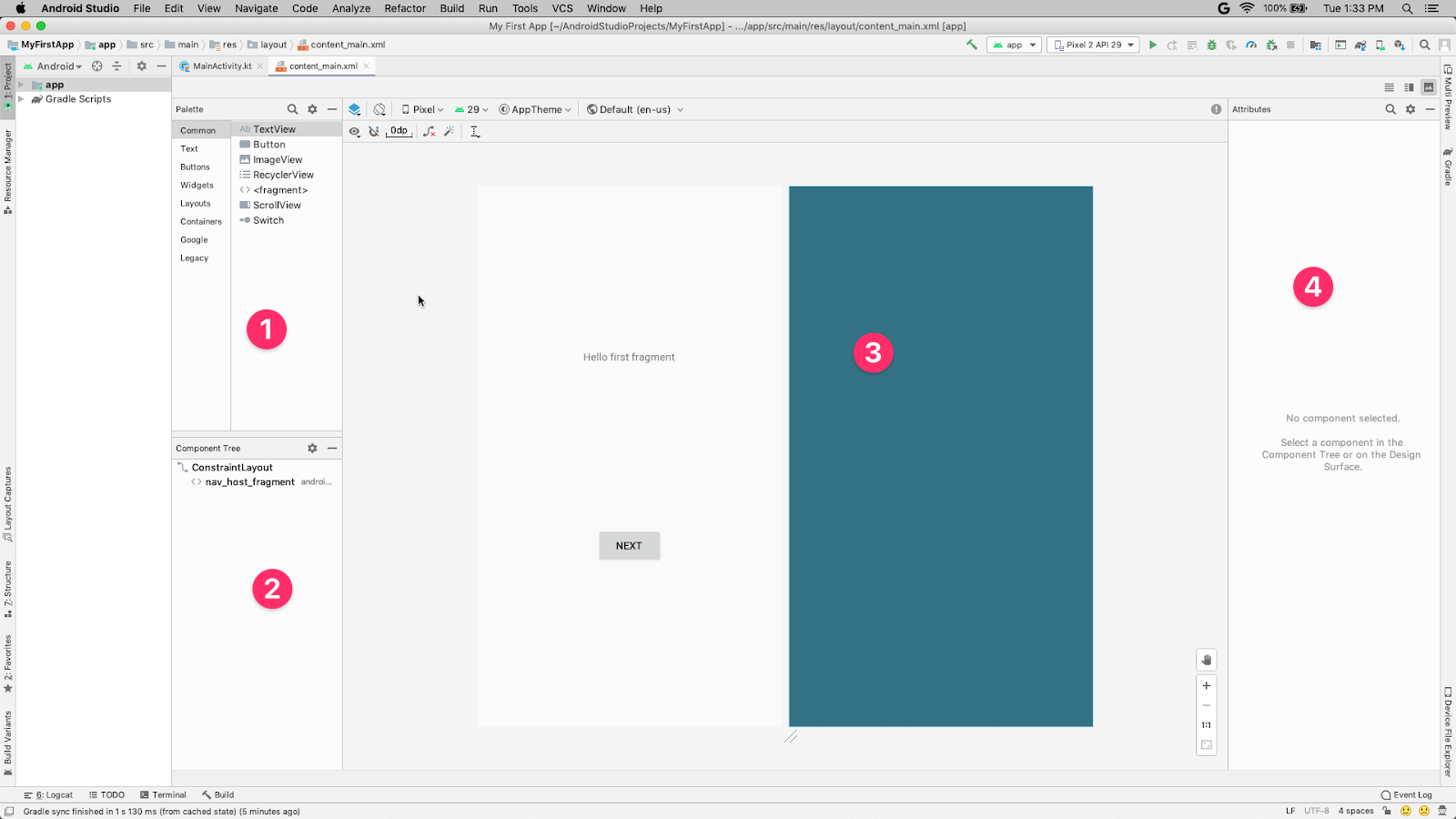 В нем можно обнаружить такие поля, как <TextView /> или <Button />. Из названий понятно, что одно поле содержит в себе текстовую информацию, а другое является кнопкой, которая может выполнять действия.