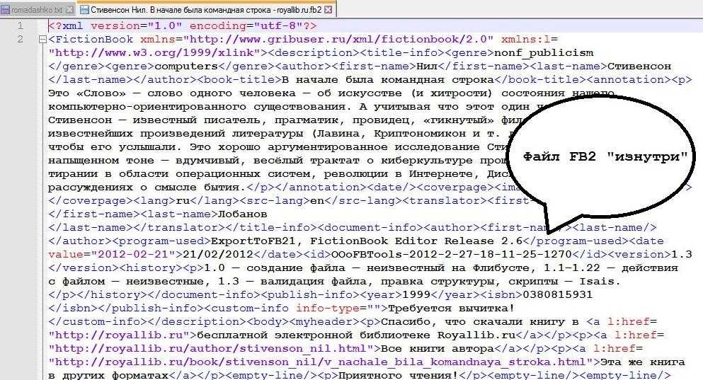 Книги в формате FB2, как уже было отмечено, это обычные XML-документы с расширением FB2, они размечаются с помощью тегов и могут содержать описание книги, обложку и картинки в двоичном формате, разделы и текст, размеченные специальным образом для удобного чтения, цитаты, таблицы и другие нужные элементы книги. Лично мне принцип разметки FB2 напоминает язык HTML, где HTML-документы точно также размечаются тегами.