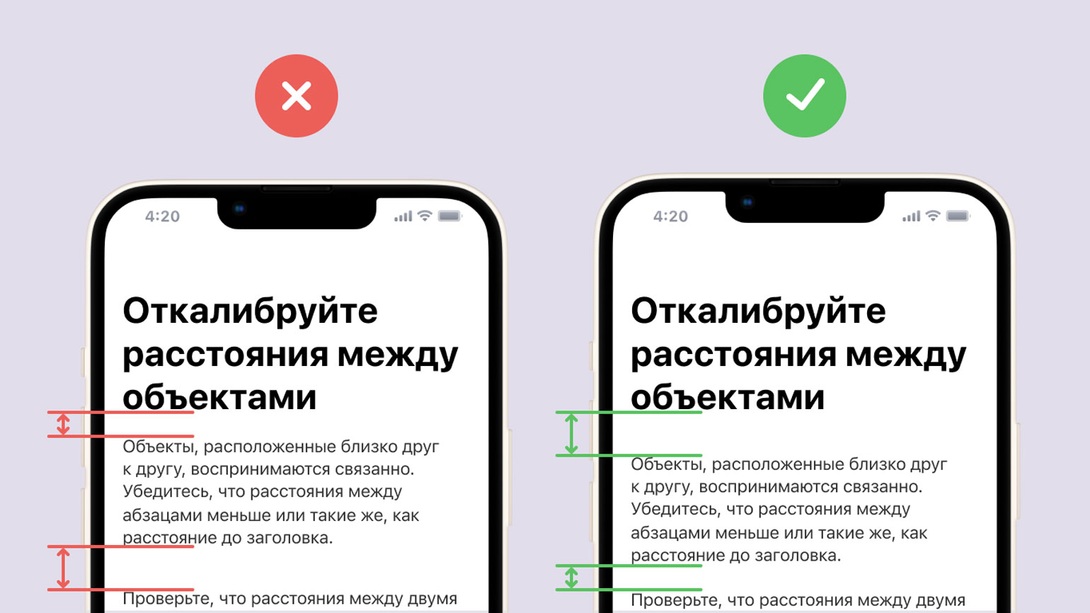 Внутренние расстояния должны быть меньше внешних на каждом из уровней. Например, отступ от основного текста у заголовка должен быть больше, чем у подзаголовка.