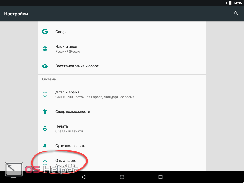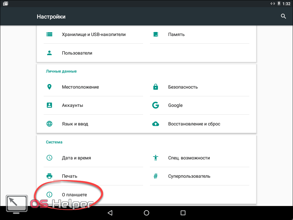 - Крутим содержимое окна в самый низ и выбираем пункт «О планшете» или «О телефоне».