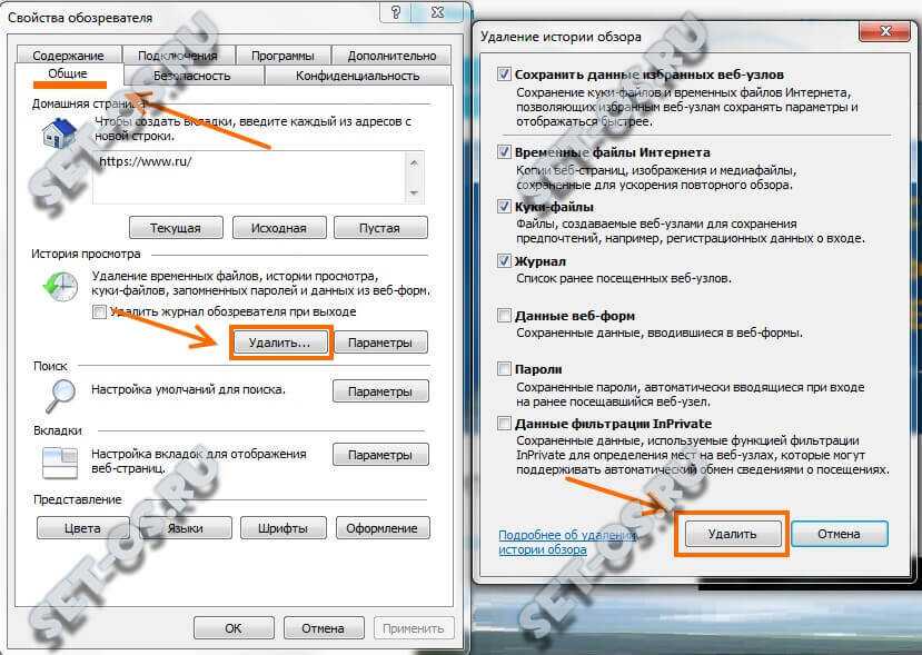 В Internet Explorer история посещений сайтов браузеров спрятана более тщательно. Чтобы её найти необходимо зайти в Панель управления Windows 10 и открыть раздел «Свойства обозревателя». В появившемся окне на вкладке «Общие» будет кнопочка «Удалить»: