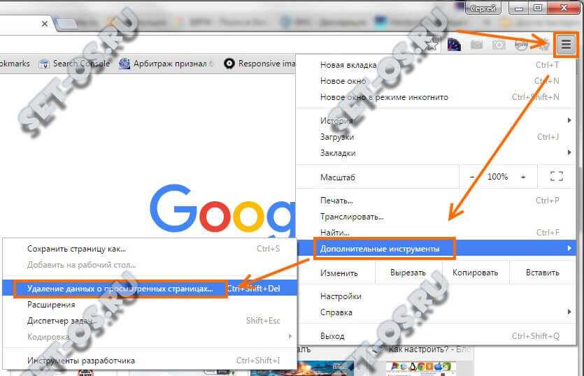 Начнём с самого популярного на сегодня веб-браузера Google Chrome. Для того, чтобы очистить историю посещений в Интернете, Вам надо открыть главное меню программы и выбрать пункт «Дополнительные инструменты»>>»Удаление данных о присмотренных страницах».