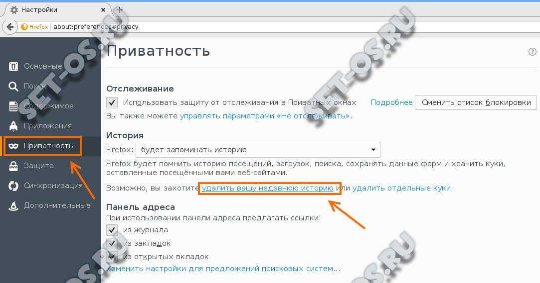 Для того, чтобы почистить историю браузера Mozilla Firefox, надо открыть настройки программы и зайти в подраздел «Приватность»: