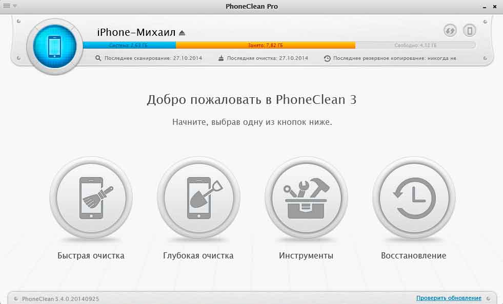 | PhoneClean | Расширенный функционал, который обеспечивает глобальный анализ IPad | 19,99$ в год или 29,99$ персональная лицензия | ★★★★★ |