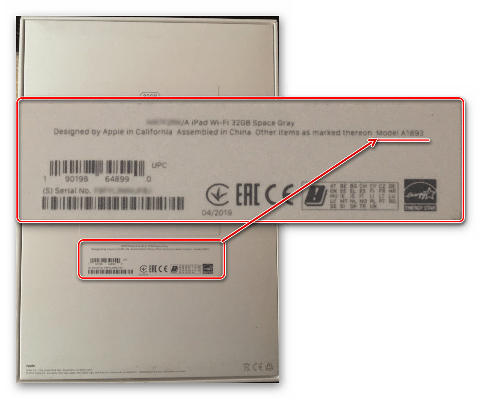 Номер модели айПад указывается на задней части его фирменной упаковки практически в том же месте, что и на корпусе – нижняя область, конец второй строки из двух доступных (показано на изображении ниже). Иногда эта же информация присутствует в чеке, а вот в официальной документации ее не найти.