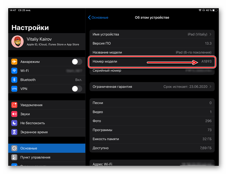 Среди прочей информации на этой странице будет указана и модель вашего Айпада.