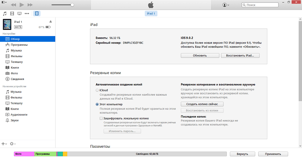 Прежде чем заниматься переустановкой операционной системы, нужно сформировать вспомогательную копию файлов, хранящихся на планшете iPad. Не переживайте — это не обязательно означает, что вам придётся восстанавливать все сведения, загружая их с компьютера — такая ситуация является скорее неприятным исключением, чем правилом. Однако иногда все данные, хранившиеся на планшете, действительно теряются. Согласитесь, не очень приятно будет утратить коллекцию музыки, сообщения в личной переписке и прочую ценную информацию. Чтобы такого не произошло, достаточно подключить iPad к домашнему компьютеру, затем открыть программу iTunes и сформировать резервную копию данных в соответствующем подразделе меню.