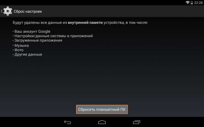 Если описываемые выше последовательности действий не принесли желаемого результата, то выход один – сбрасывание к заводским параметрам. Но тогда вся введённая выше информация будет уничтожена. По этой причине при необходимости сохранения данных нужно обратиться к мастерам. Ниже описана последовательность сброса к заводским параметрам. Она подойдёт для планшетов любой модели.
