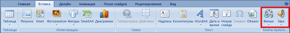 Видео и звук. Соответствующие кнопки также находятся во вкладке «Вставка». «Звук» добавляет к слайду музыкальное сопровождения, а «Фильм» (Видео) – видеоролик.