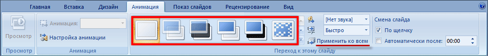 Здесь можно выбрать подходящий переход. По умолчанию он применяется к тому слайду, который открыт в данный момент. Но можно применить и ко всем слайдам сразу, для этого нажать на кнопку «Применить ко всем».