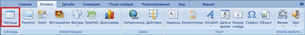 Добавляем таблицу в презентацию