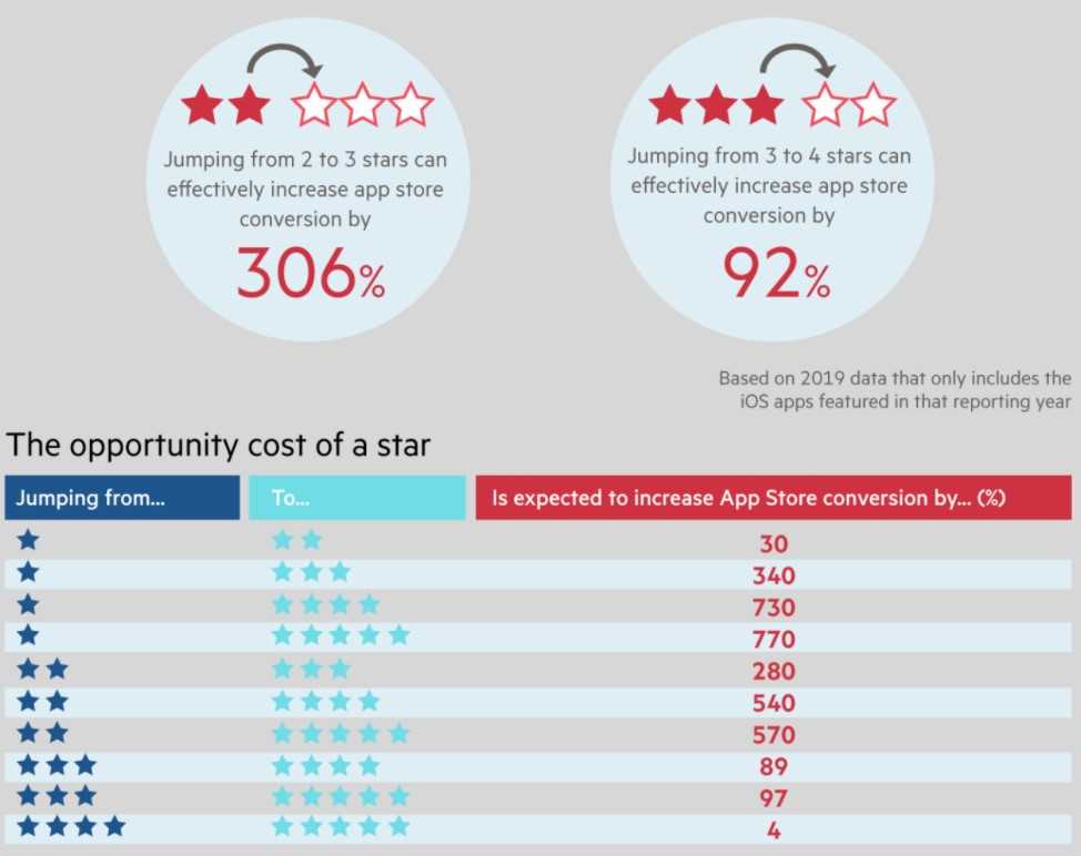- Повышение рейтинга с 3 до 4 звезд увеличивает конверсию от пользователей на 92%. Большая часть пользователей не могут смириться с тем, что приложение имеет 3 звезды, но считают 4 из 5 – уже приемлемым.