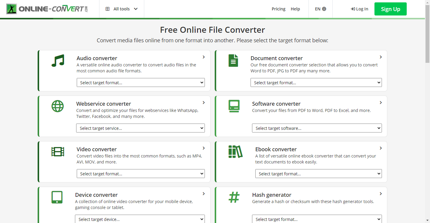 На этом сервисе есть даже возможность конвертировать веб-сервисы. Система поддерживает достаточно большое количество распространённых форматов аудио и видео. Что касается ограничений в плане размера или количества конвертируемых файлов, то их нет. Но на этой платформе не помешала бы опция пакетной конвертации (которой, к сожалению, нет). Впрочем, сервис способен удовлетворить требования среднестатистического пользователя.
